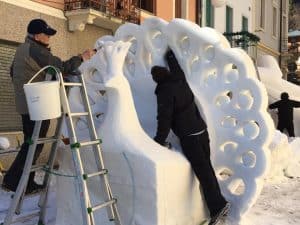 In corso a Pontebba la seconda edizione del Festival internazionale delle sculture di neve, lo Snow Art. Sono in fase di ultimazione le splendide opere realizzate dai team in campo, al lavoro sui cubi di ghiaccio da sabato.  Questo festival è una manifestazione molto amata ed apprezzata dal pubblico di ogni età, per gli slanci di fantasia che riesce a trasmettere, la magia di questo elemento effimero (la neve), la creatività e l’ingegneria, tutte componenti del mondo delle sculture di neve.