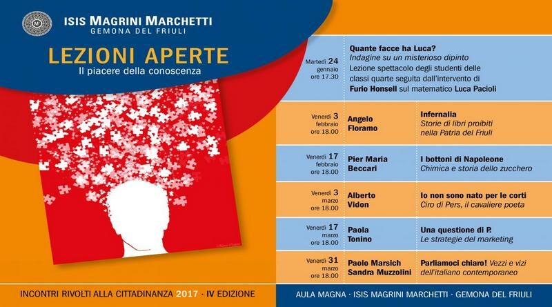Dopo la lezione spettacolo degli studenti e il brillante intervento di Furio Honsell sul matematico Luca Pacioli, proseguono le Lezioni Aperte al Magrini Marchetti di Gemona con l’intervento di Angelo Floramo su “Infernalia. Storie di libri proibiti nella Patria del Friuli”. Appuntamento venerdì 3 febbraio, alle ore 18 nell’Aula Magna dell’Istituto.