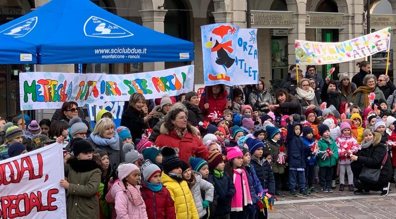 A Tolmezzo il TEAM FVG, con i suoi atleti, ha ricevuto un caloroso benvenuto, in piazza XX Settembre, da parte delle centinaia di studenti (dalle scuole d’infanzia fino alle superiori) accompagnati da un bel numero di insegnanti e maestre.