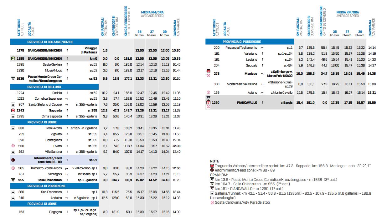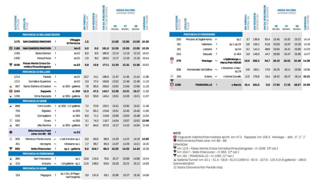 Proponiamo la cronotabella, con gli orari del passaggio della carovana e quello della corsa (previste tre medie).