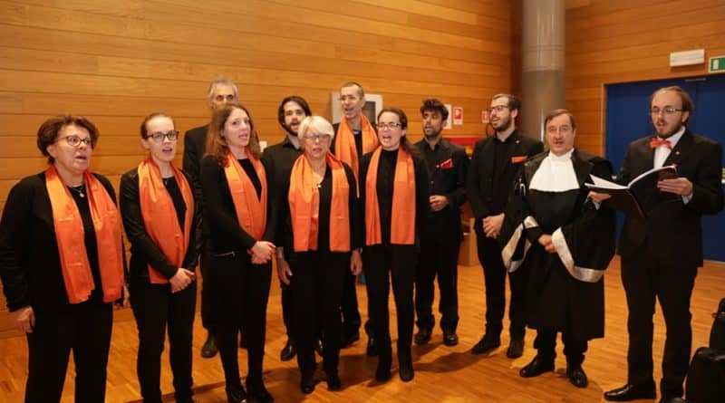 Prima dell’applauditissima lectio, il momento ufficiale del conferimento della laurea magistrale a D’Aronco alla presenza di tutta la commissione di laurea, presieduta dal rettore (presidente) e composta dai seguenti membri: Raffaella Bombi, direttrice vicaria del Dipartimento di Studi umanistici e del patrimonio culturale e delegato del rettore per Efficacia e semplificazione della comunicazione istituzionale; Maria Cristina Nicoli, delegato del rettore per la Ricerca; Enrico Peterlunger, direttore del CIRF, Centro interdipartimentale di ricerca sulla cultura e la lingua del Friuli dell’Università degli studi di Udine “Josef Marchet” e delegato del rettore per la promozione della lingua e cultura friulana; Roberto Pinton, prorettore vicario dell’Università; Raimondo Strassoldo Graffembergo, già docente di Sociologia presso l’Università degli Studi di Udine; Andrea Tilatti, docente di Storia medievale al Dipartimento di Studi umanistici; Matteo Venier, ricercatore di Letteratura Italiana nello stesso dipartimento; Federico Vicario, presidente della Società Filologica Friulana e docente al Dipartimento di Lingue e Letteratura, comunicazione, formazione e società; Andrea Zannini, direttore del Dipartimento di studi umanistici; Stefano Magnani, ricercatore di Storia romana, e Rodolfo Zucco, ricercatore di Linguistica Italiana presso lo stesso dipartimento. Gran finale della cerimonia con il canto “Gaudeamus Igitur” eseguito dal Coro dell’Università di Udine.