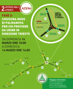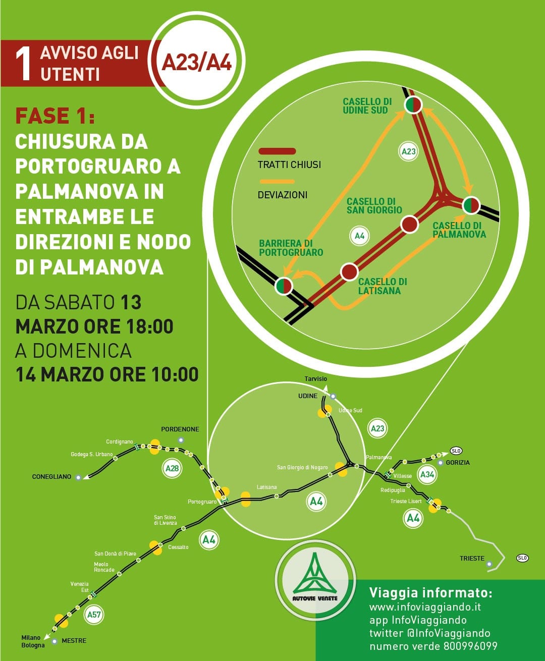 I lavori per la costruzione della terza corsia si concentrano in questo fine settimana in due punti nevralgici della rete di Autovie Venete. Si tratta di una serie di cantieri che comporteranno la chiusura da Portogruaro al casello di Palmanova dell’autostrada A4 in entrambe le direzioni marcia dalle ore 18,00 di sabato 13 marzo alle ore 10,00 di domenica 14. Nella stessa fascia oraria sarà chiusa anche l’autostrada A23 da Udine Sud fino al Nodo di Palmanova con divieto di circolazione prolungato fino alle ore 14,00 di domenica 14 della direttrice Udine – Trieste dello stesso Nodo. Pertanto dalle 10,00 di domenica 14 chi percorre la A23 potrà dirigersi nuovamente a Venezia, chi, invece è diretto a Trieste dovrà sempre uscire a Udine Sud, percorrere la viabilità ordinaria e rientrare allo svincolo di Palmanova.