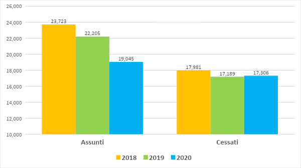 Le cessazioni sono state pari a 17.306 unità, con un saldo positivo di 1.739, notevolmente inferiore a quello registrato nei primi tre mesi del 2019, 5.016, e del 2018, 5.742.