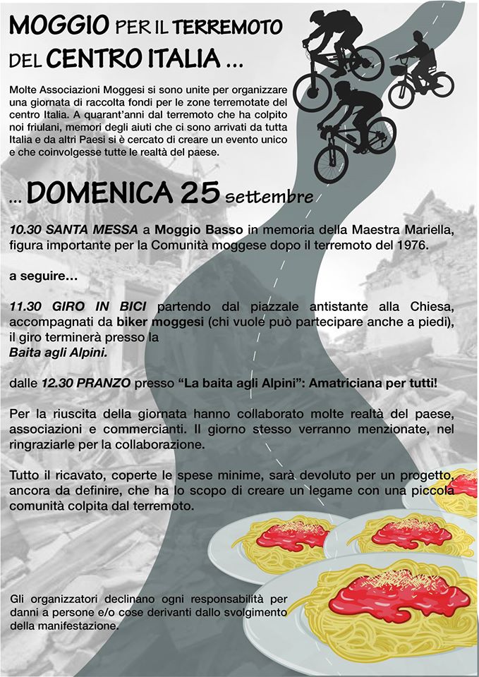Molte associazioni di Moggio Udinese si sono unite per organizzare domenica 25 settembre una giornata di raccolta fondi per le zone terremotate del centro Italia.