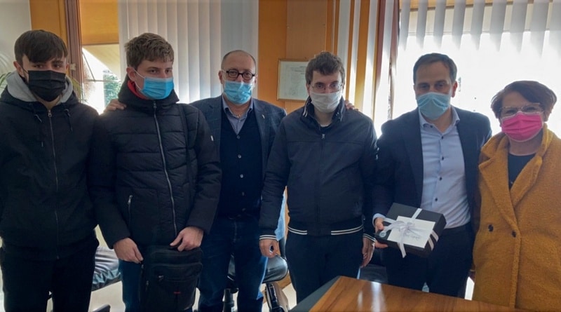 Presenti alla consegna l’assessore alle politiche sociali del Comune di San Daniele Cominotto, il direttore dello Scriptorium Giurano, l’educatore Del Negro e i ragazzi, veri protagonisti dell’opera, Morandini e Vidoni.