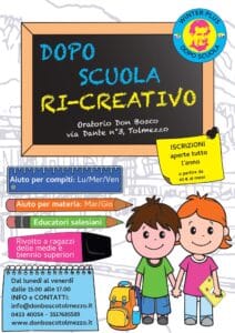 - Doposcuola (compiti generici): un servizio di supporto allo svolgimento dei compiti su base settimanale, disponibile il lunedì, mercoledì e venerdì, dal 30 settembre al 30 maggio. Le famiglie possono scegliere tra 1, 2 o 3 giorni a settimana, con quote mensili a partire da 40 a 50€.