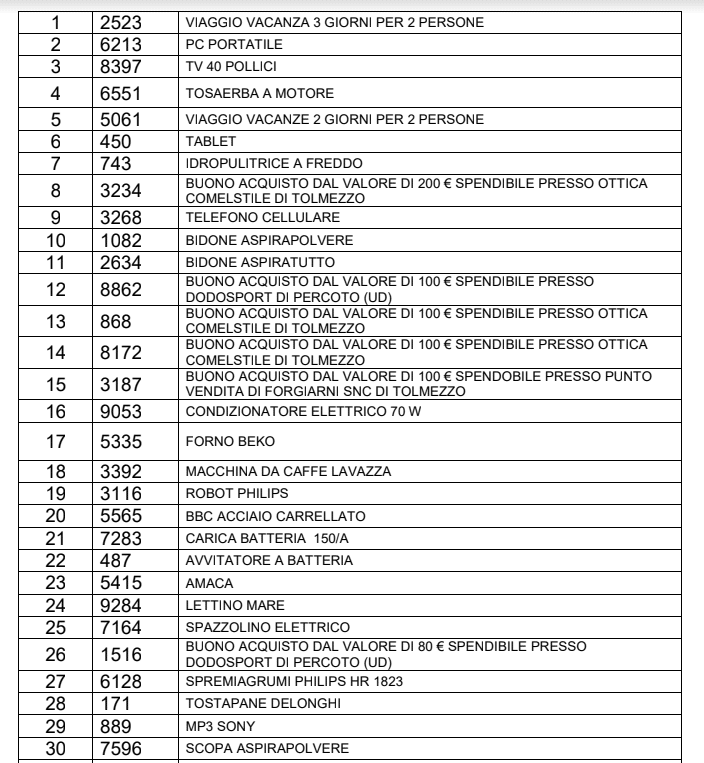Proponiamo i numeri vincenti della lotteria Conca Tolmezzina, organizzata dall’Asd Cavazzo, ricordando che per il ritiro dei premi è necessario contattare entro il 23 ottobre il numero telefonico 366 2323926.