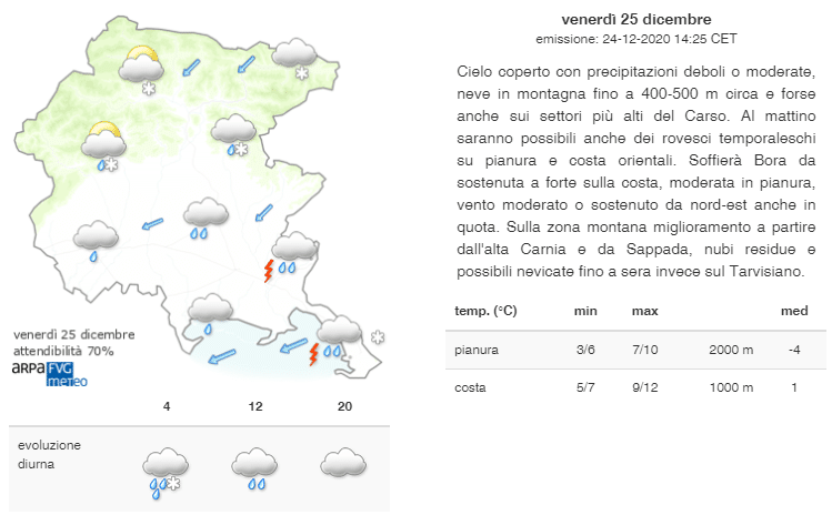 Secondo l’ARPA FVG l’aumento della nuvolosità si avrà dalla serata di domenica 27.  Nella notte e al mattino di lunedì 28 possibili nevicate abbondanti anche in pianura e fose inizialmente anche sulla costa. In giornata piogge abbondanti in pianura, con possibili temporali. Soffierà vento forte o molto forte da sud o sud-est su tutte le zone, seguito poi in serata da Libeccio sulla costa. Possibili mareggiate e acqua alta.