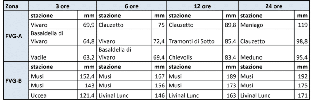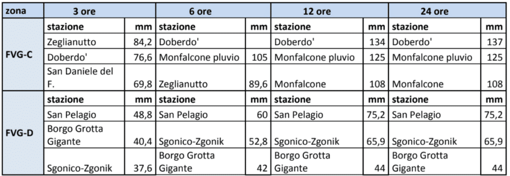 In tabella le precipitazioni massime in 3, 6, 12 e 24 ore da inizio evento.