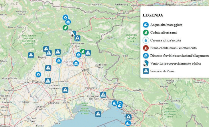 Si registra un innalzamento dei livelli idrometrici di riferimento nei corsi d’acqua. In particolare l’idrometro di Venzone alle ore 14:45 ha raggiunto il picco di 2.16 m superando il livello di guardia posto a 1.90 m, il livello è già sceso il livello di guardia e si prevede un continuo calo; l’idrometro di Madrisio alle ore 16:30 misura 2.56 m superando il livello di guardia posto a 2.00 m, si
