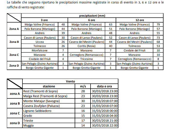 La regione continua ad essere interessata da un sostenuto afflusso di correnti molto umide ed instabili, da SudOvest in quota, da Sud o Sud-Est nei bassi strati, con raffiche del vento sul mare fino a 60 Km/h. Nelle ultime 12 ore le precipitazioni (pioggia fino a 1800 m circa, neve alle quote superiori) sono state localmente intense e irregolarmente distribuite sulla zona montana, con cumulati compresi fra 30 e 80 mm, valori inferiori sono stati registrati sulla Carnia occidentale.
