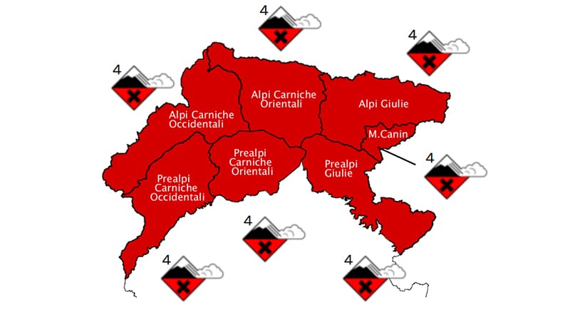 Dalla mattinata previste nuove nevicate al di sopra dei 400-600 m con 10-20 cm a Ovest e 30-40 cm a Est. Venti meridionali sostenuti. La presenza di consistenti spessori di neve recente non consolidata mantiene 4 (forte) il pericolo di valanghe. Saranno probabili distacchi spontanei di valanghe di medie e grandi dimensioni a tutte le esposizioni sia a debole coesione che a lastroni lungo i percorsi abituali in forte pendenza, anche sotto il limite del bosco. Localmente a Nord saranno possibili anche valanghe molto grandi soprattutto nell’area del Canin. I fenomeni valanghivi potranno interessare i tratti della viabilità soggetta a pericolo al di sopra dei 500 m. Il distacco provocato anche di grandi valanghe sui pendii ripidi potrà avvenire già al passaggio di un singolo sciatore/escursionista. Condizioni sfavorevoli alle escursioni, richiesta la massima cautela.