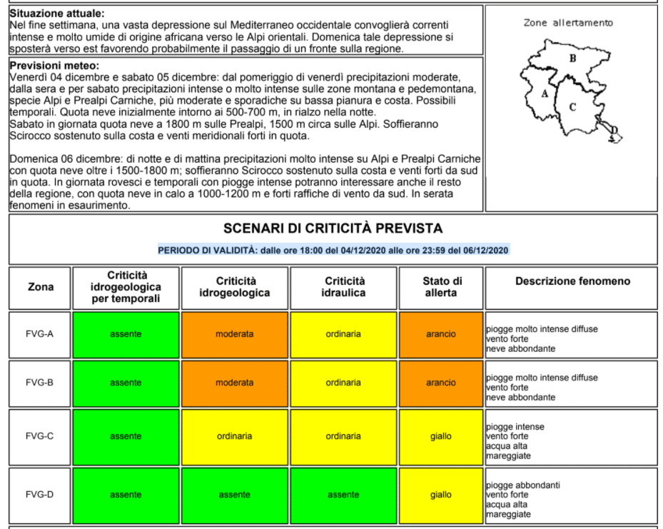 La Protezione Civile FVG ha emanato un’Allerta Regionale, con un avviso meteo, di criticità idrogeologica e di criticità idraulica, valida dalle 18 di venerdì 4 dicembre alle 23.59 di domenica 6.