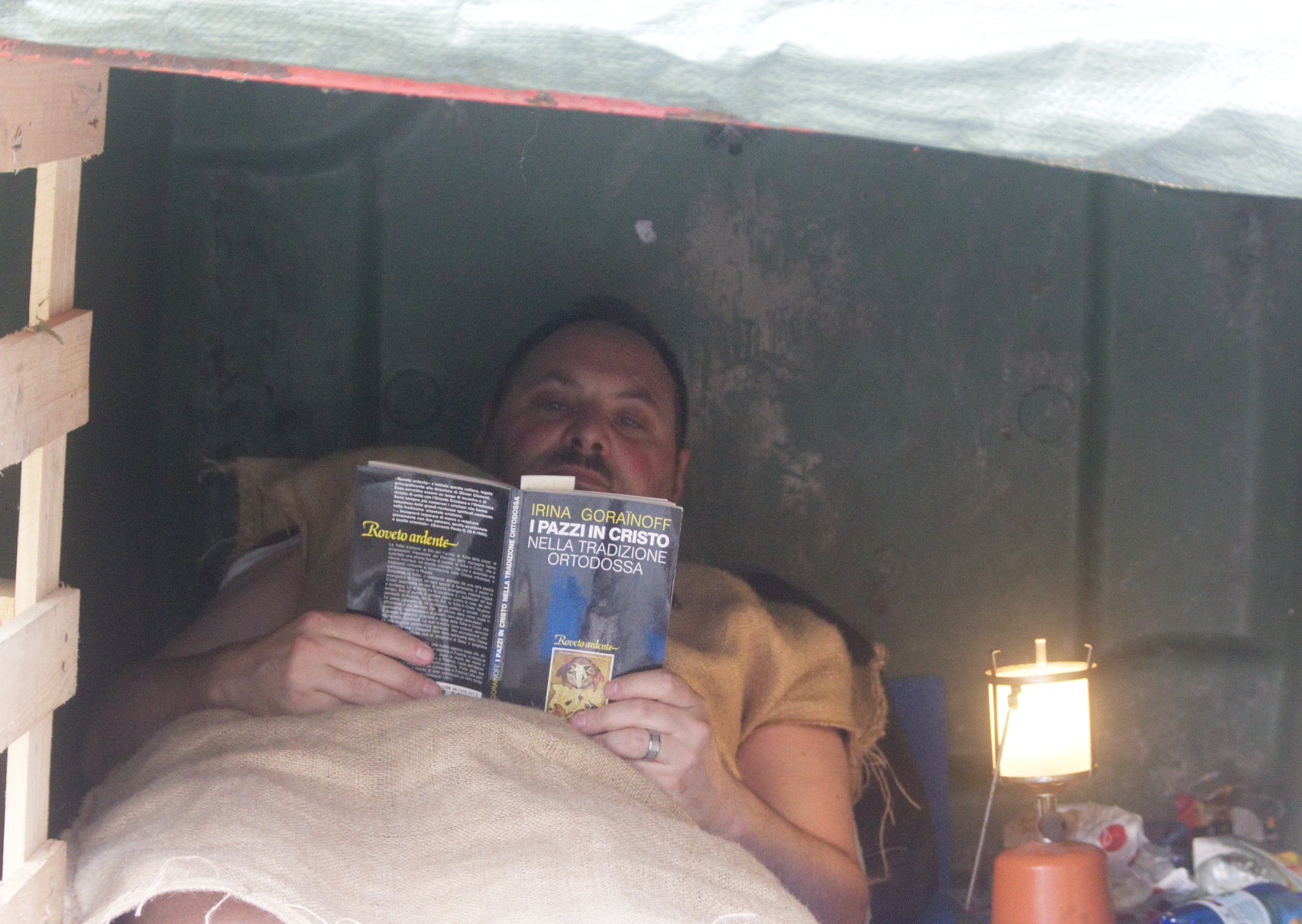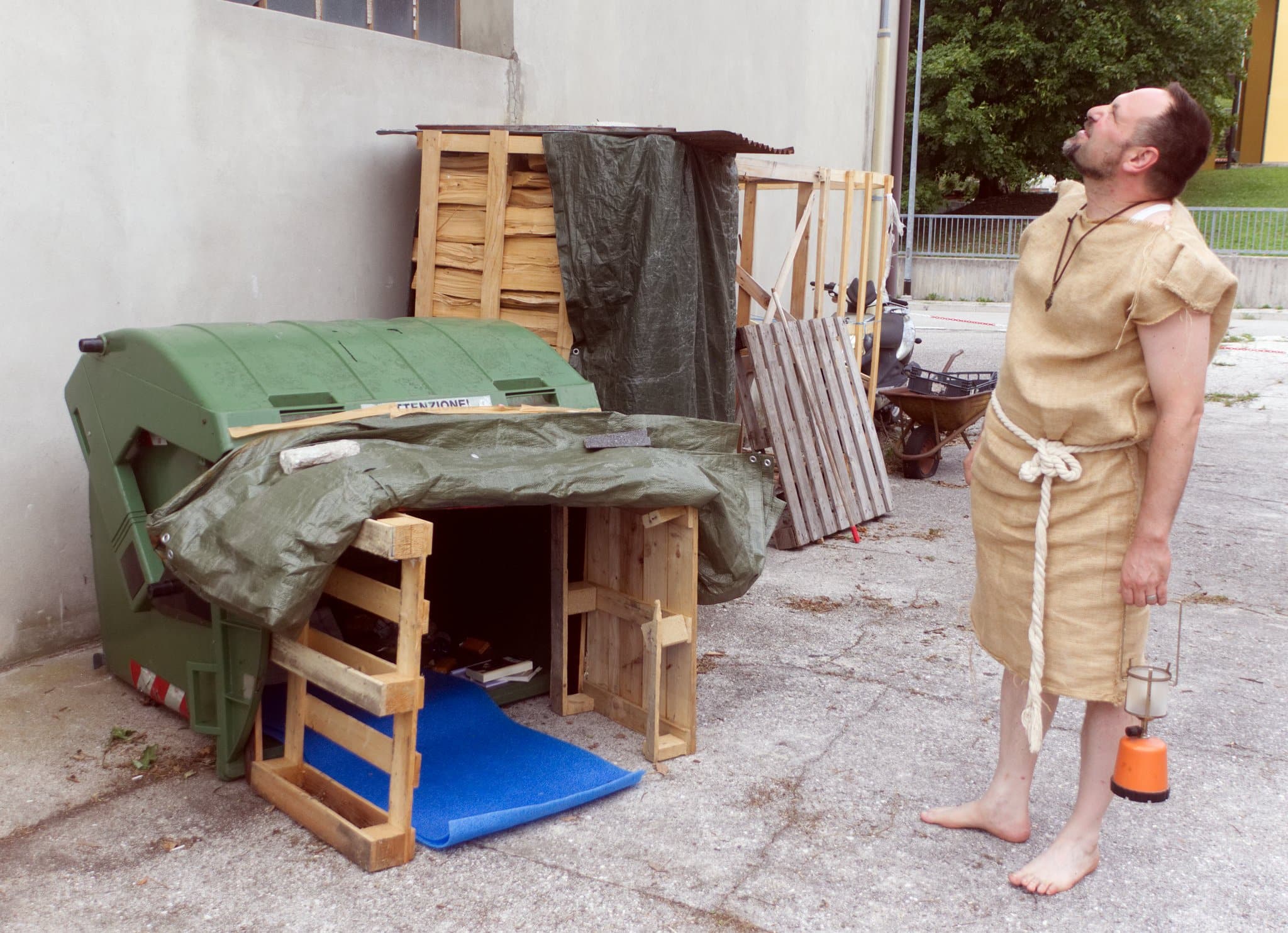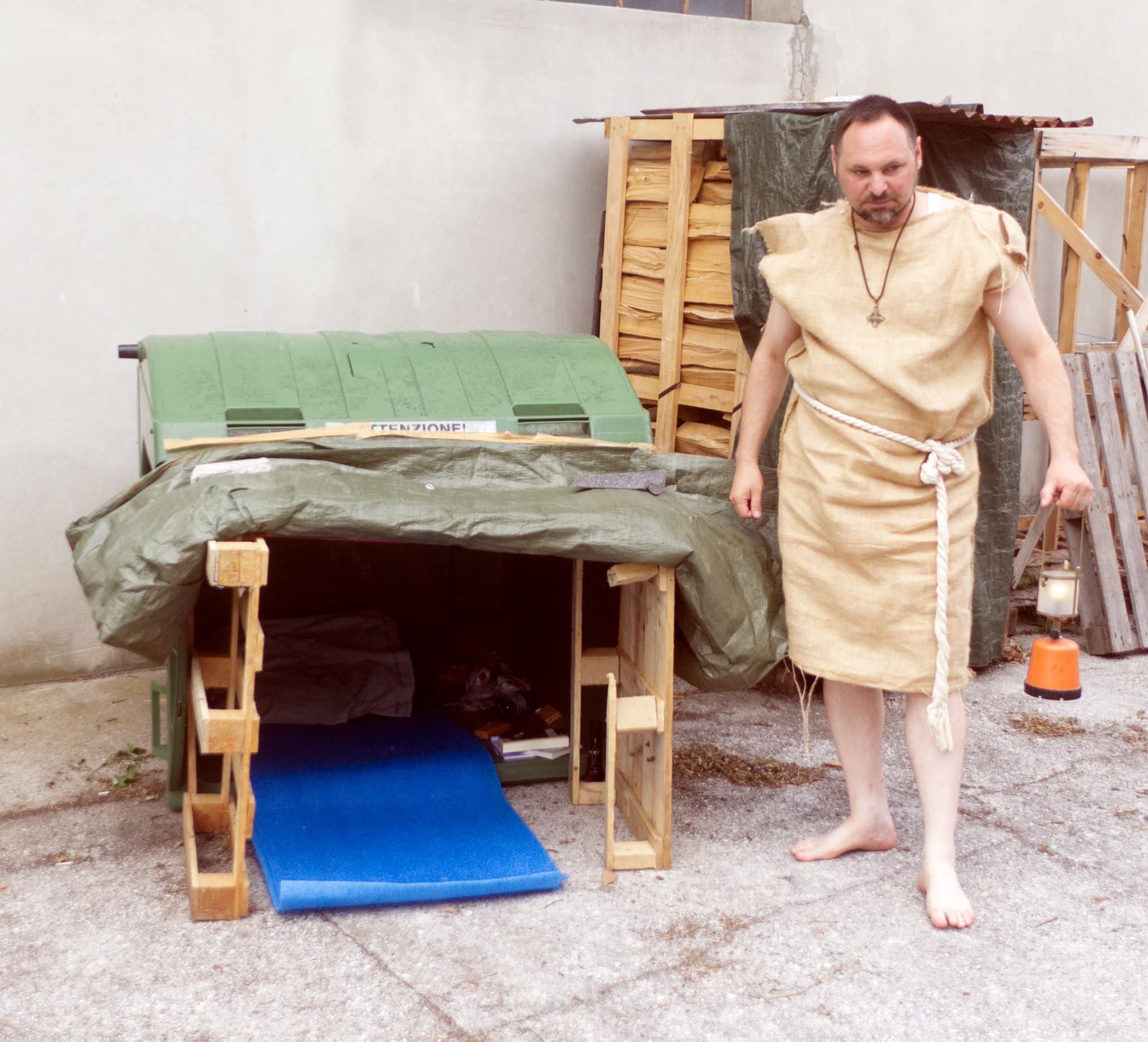 “A quarant’anni la scelta di andare a vivere in un bidone dei rifiuti, vestire solo con un sacco di iuta e rifiutare l’uso del denaro – spiega lo stesso scrittore – può avere diversi significati. Una protesta contro le convenzioni sociali? Una emulazione di San Francesco? Anche. Soprattutto una provocazione artistica per invitare la riflessione sulla caducità della condizione umana. Un gesto che vuole essere una protesta al consumismo e alla mentalità iper-commerciale di questa società senza valori per riscoprire ciò che veramente non andrà mai al macero: i nostri valori e i nostri ideali”.