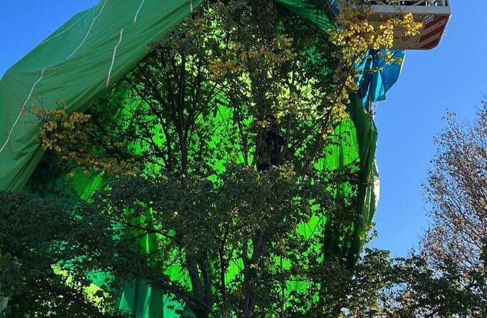 Illese le due persone a bordo del pallone aerostatico che dopo l’impatto è rimasto impigliato sulla chioma della pianta.