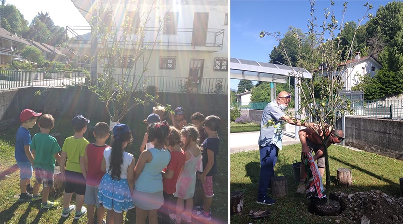 “Tutto è partito dall’idea di uno dei papà, Giulio Contessi – spiega la rappresentante dei genitori Annalisa Galliussi -, che ha provveduto di persona a collocare la pianta nel punto prescelto. Già anni fa i genitori avevano donato un albero di ciliegie e lo scopo è che i piccoli che frequentano la scuola dell’infanzia vedano il melo crescere assieme a loro e ogni volta, a settembre, potranno pure mangiarne i frutti”.