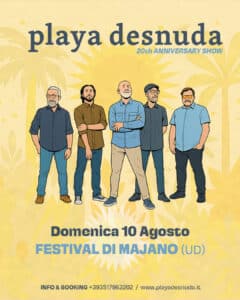 Domenica 10 agosto, alle 21.00 in Piazza Italia, in programma il concerto dei Playa Desnuda, che tornano a Majano sull’onda dei festeggiamenti per i vent’anni di attività. Era infatti il 2005 quando la band, fondata da Michele PolettoWalter SguazzinJvan Moda e Pietro Sponton, si presentò al Madrid di Udine per suonare qualche canzone da spiaggia spogliandola dei suoi arrangiamenti (da qui il nome) e riproponendola in chiave reggae, ska e rocksteady, con elementi latineggianti. Un progetto nato per gioco, che nel corso degli anni li ha portati a suonare in mezza Europa, in primis in Spagna, collezionando collaborazioni di grande caratura, aperture ad artisti come Manu Chao e Fatboy Slim e di recente, in occasione della loro festa di compleanno, a salire sul palco con Roy Paci e Bunna degli Africa Unite. Per tutto il 2025, i Playa Desnuda porteranno in giro il loro show celebrativo con i membri originali e alcuni musicisti ospiti, proponendo tutte le canzoni che li hanno resi una delle band più apprezzate e seguite della regione. Ad aprire la serata ci sarà Cilio, cantante pop, rap e funky. Prossimi appuntamenti al Festival le serate Deejay Time (14 agosto) e Cinedisco 2 (17 agosto, ingresso libero). Info e programma completo del 65° Festival di Majano su www.promajano.it.