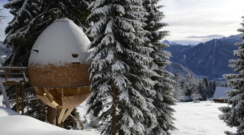Il progetto Tree Houses, nato dalla mente dell’arch. Claudio Beltrame e realizzato dalla DomusGaia di Udine, consiste in due casette sull’albero sospese a 10 metri di altezza ricalcanti la forma della conifera, in grado di accogliere gli ospiti su tre livelli.