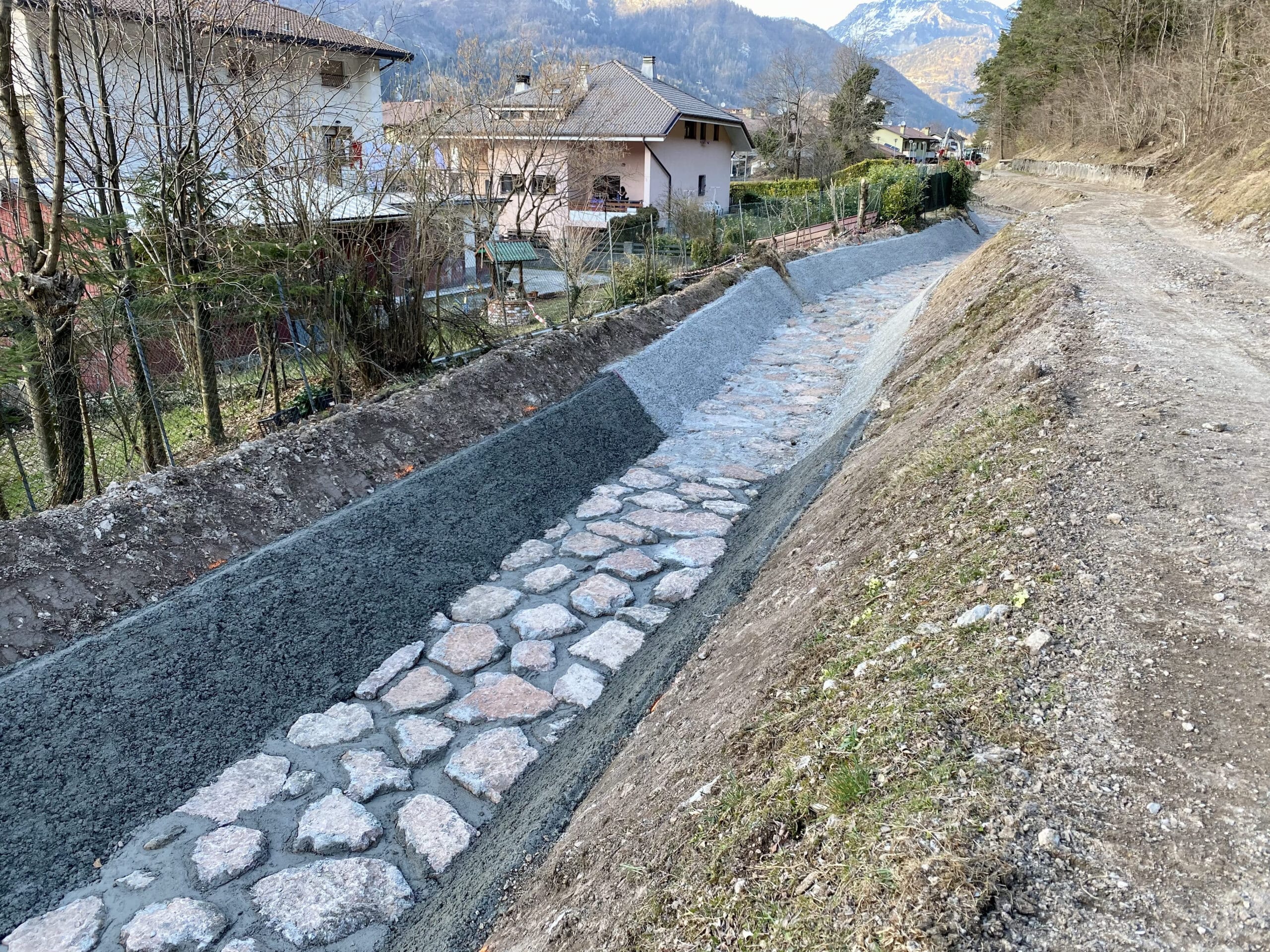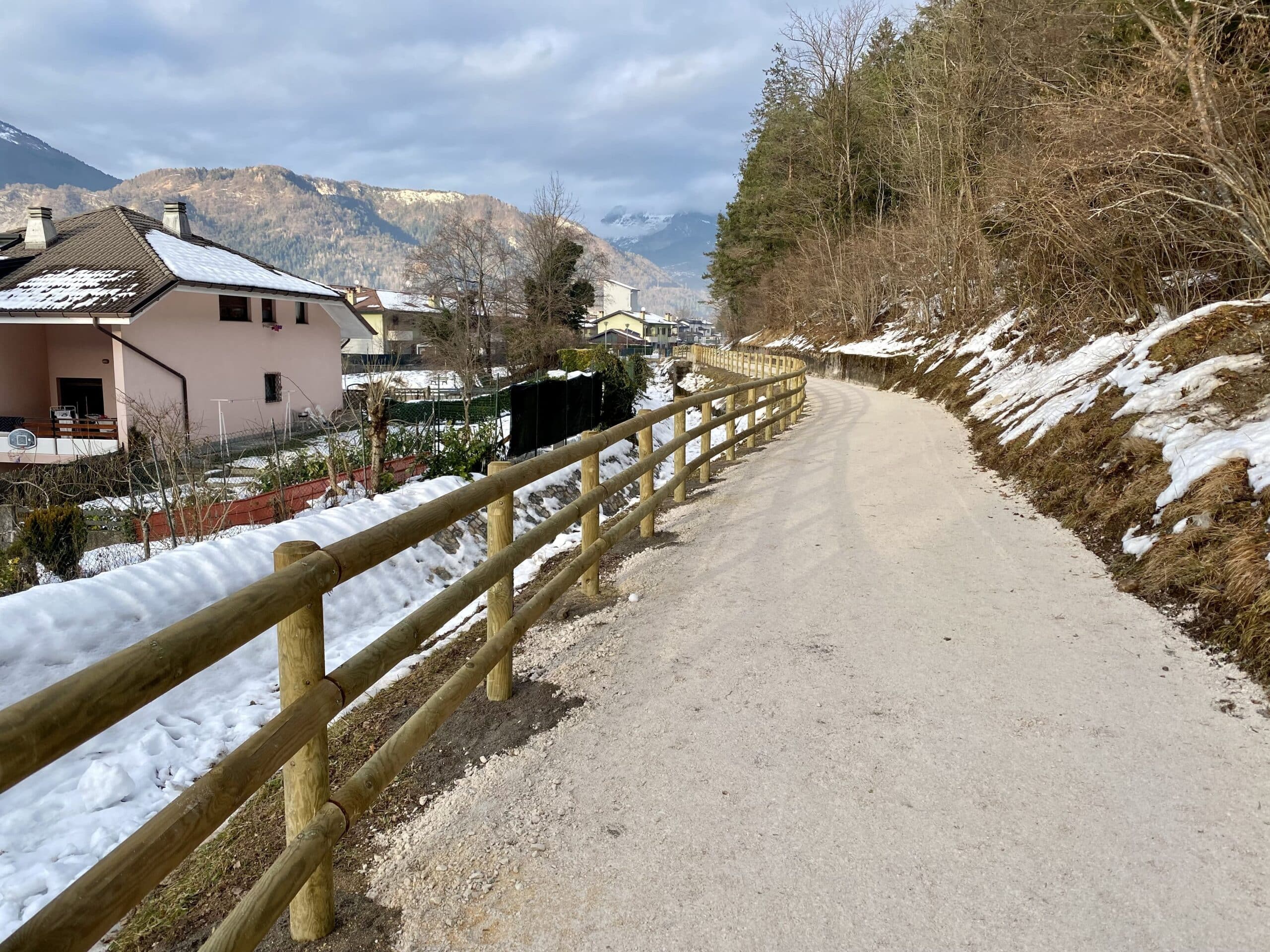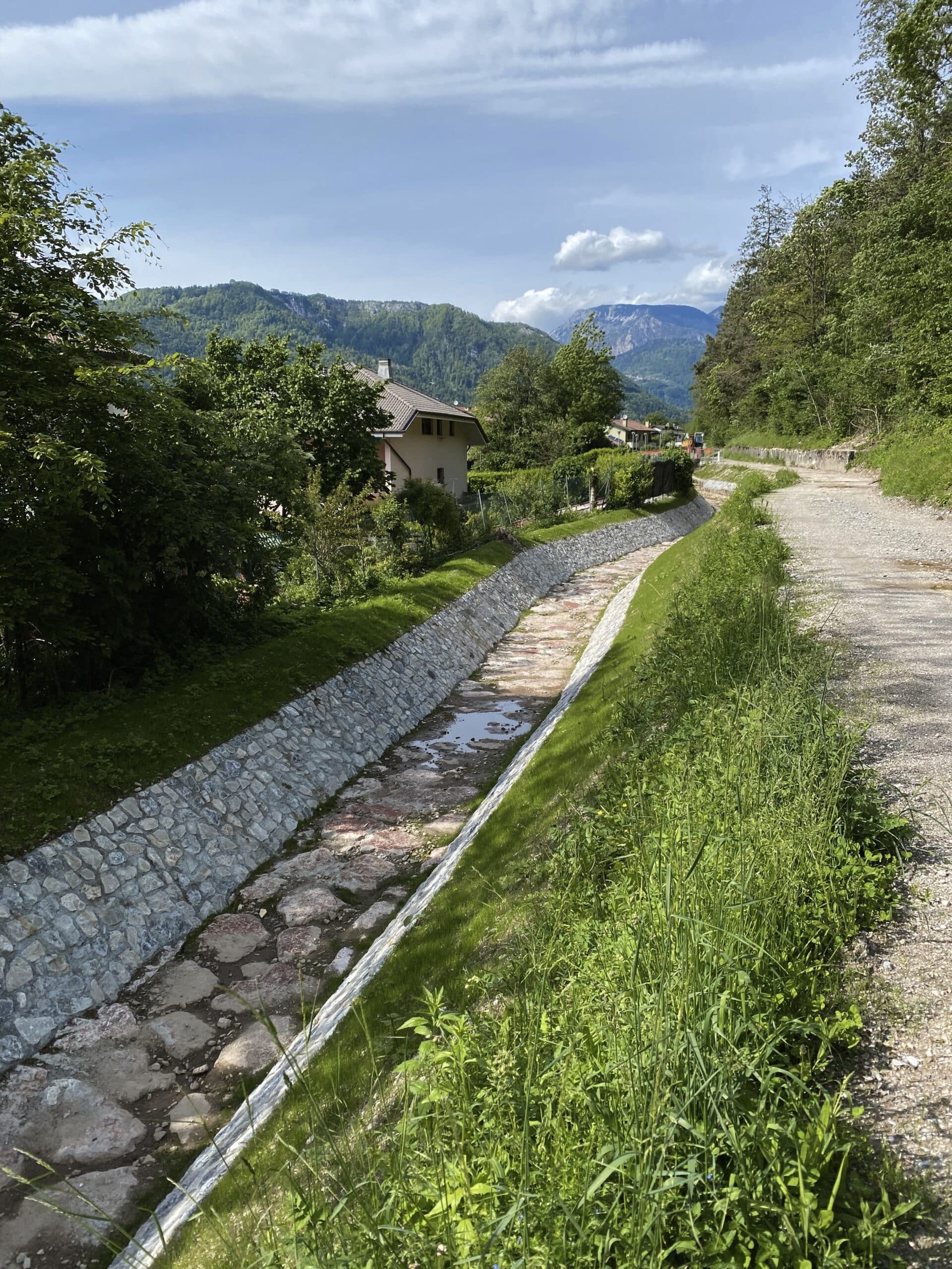 A seguito di questi lavori e nell’ottica di valorizzare il percorso sterrato sotto monte per renderlo più fruibile da bambini e famiglie, è stato sistemato il fondo stradale con la posa di materiale ghiaioso stabilizzante bianco, sono state installate staccionate in legno a margine del canale al fine di rendere maggiormente sicura la passeggiata e cestini per la raccolta delle deiezioni canine.
