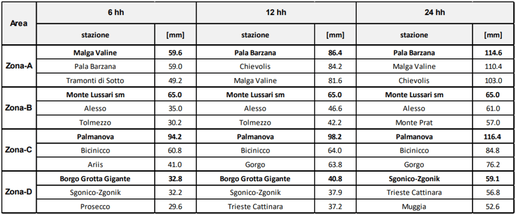 Dall’inizio dell’evento si sono registrati fino a 100 mm in Carnia, oltre 130 mm sulle Prealpi Carniche, fino a 80 mm sulle Prealpi Giulie, tra 30 e 80 mm su pianura e costa. Nel primo pomeriggio un temporale sulla zona di Palmanova ha portato oltre 70 mm di cui quasi 50 mm in un’ora.