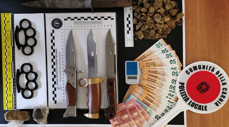 Le perquisizioni hanno confermato l’ipotesi investigativa, consentendo agli ufficiali ed agenti della Polizia Locale di rinvenire e sequestrare armi, sostanze stupefacenti e strumentazione utilizzabile per la coltivazione della cannabis, quali una serra di materiale sintetico, diverse lampade UV, ventilatori, deumidificatori, fertilizzanti chimici, termometri e cataloghi cartacei contenenti istruzioni e dosaggi per la coltivazione oltre a sostanza di natura stupefacente. Sono stati rinvenuti e sequestrati poi oltre 50 grammi di hashish, altrettanti di infiorescenze di marijuana pronte per il consumo e più di mille euro in contanti in banconote di piccolo taglio.