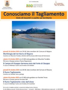 Del fiume Tagliamento si occuperà il geologo Daniele Tenze, in una seconda conferenza che avrà luogo giovedì 24 ottobre alle 20.30 sempre nella sala consiliare di Mahano. L’uscita successiva alla scoperta del Tagliamento si svolgerà sabato 26 ottobre (ritrovo alle 15 a Cimano presso la fermata SAF).