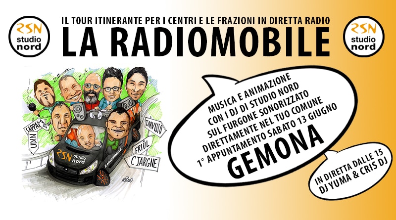 Prende il via sabato 13 giugno da Gemona “La Radiomobile”, un nuovo format di evento itinerante proposto da Radio Studio Nord, che prevede il passaggio del furgone della radio, allestito con una sonorizzazione esterna posta sul tetto, attraverso le vie del centro e delle frazioni dei comuni coinvolti.
