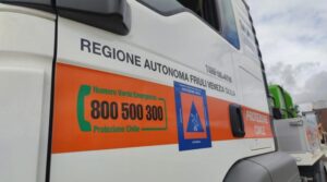 Un mezzo della Protezione civile Fvg in partenza per la Marche