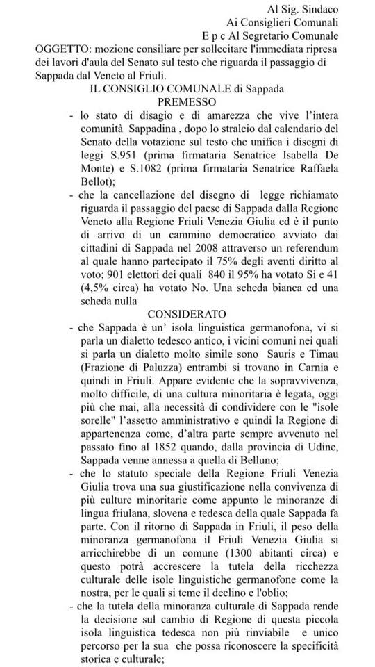 La mozione ripercorre tutte le tappe del lungo iter e “si appella al Presidente della Repubblica, Sergio Mattarella, affinchè, dopo mesi di inutili attese, possa sensibilizzare, sollecitare il Presidente del Senato, Sen. Pietro Grasso, per il reinserimento, all’ordine del giorno dei lavori d’aula, della discussione e votazione sul testo di legge che unifica le proposte S.951 (prima firmataria Senatrice Isabella De Monte) e S.1082 (prima firmataria Senatrice Raffaela Bellot) e dare finalmente, dopo anni di attesa, le giuste risposte alle legittime richieste democratiche avanzate dai cittadini di Sappada che vogliono transitare nella Regione del Friuli Venezia Giulia“.