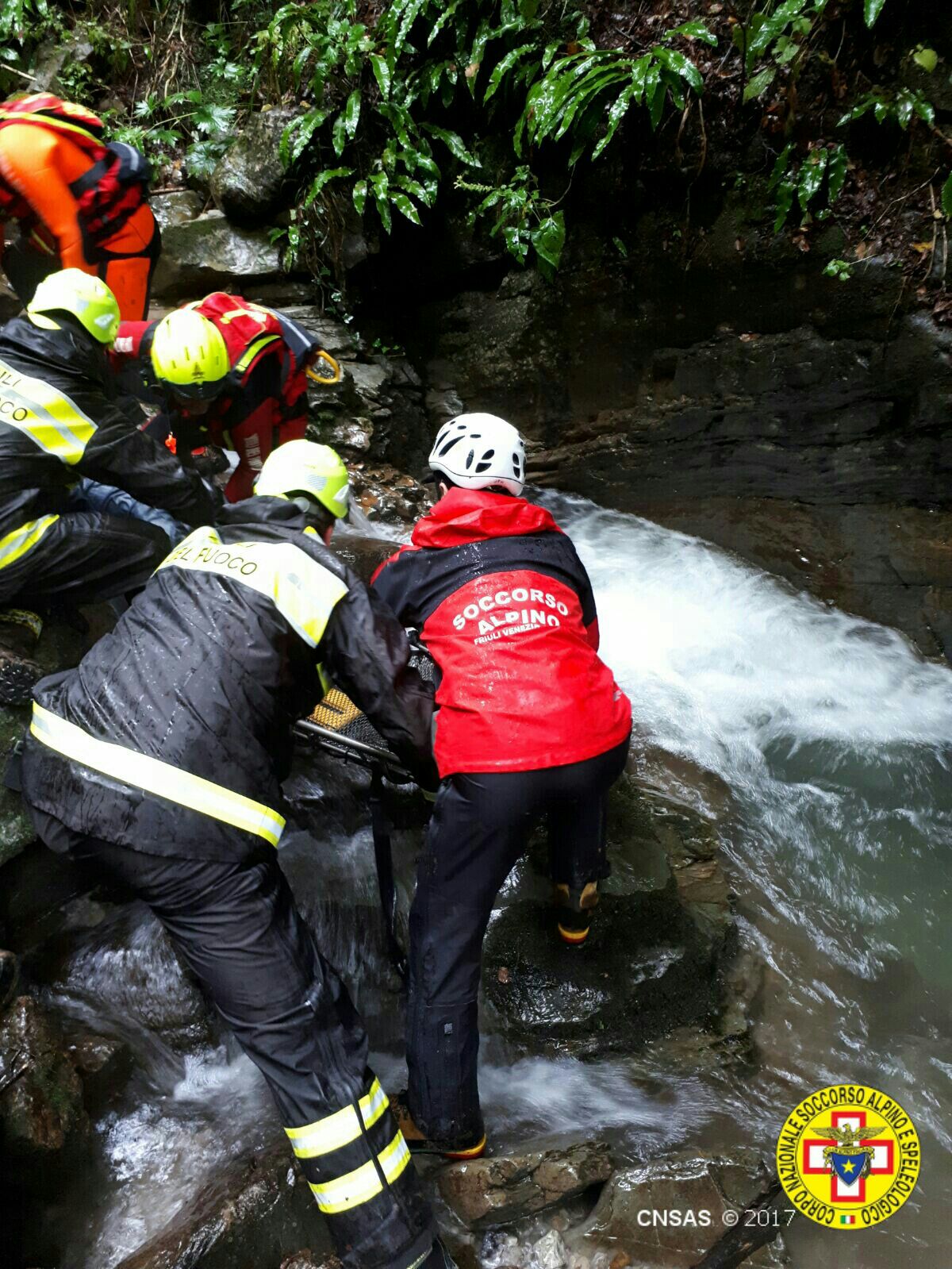 Al momento piove con una discreta intensità e si sta valutando se effettuare il ecupero con il verricello o il gancio baricentrico di uno degli elicotteri in una pausa delle precipitazioni, oppure se impiegare solo manovre di corda da terra. In entrambi i casi non sarà semplice, né immediato.
