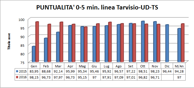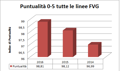 La puntualità rilevata lungo la linea Tarvisio-UD-TS è stata pari al 97% (contro il 94,28% del 2015).
