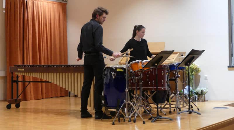 Uno spettacolare set di percussioni, dalla grand marimba al vibrafono fino a congas e grancasse. Con questa corposa e preziosissima dotazione, i giovani musicisti Daniel Ciacchi e Mia Kristan (nella foto) si esibiranno in un programma davvero unico per il primo appuntamento della nuova stagione di “musica insolita” del Salotto Musicale del Fvg, in agenda sabato 25 novembre alle 21 nella Sala Grande di Palazzo Pico a Fagagna. Come da tradizione “salottiera”, la scaletta della serata, intitolata “As one”, sarà una proposta originale, di grande varietà timbrica e stilistica. Le composizioni includono sia pietre miliari del secondo Novecento sia alcuni tra i più interessanti autori contemporanei viventi, per solo e duo di percussioni.