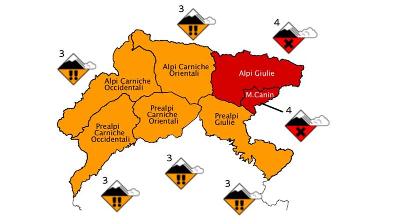 Pericolo valanghe forte (4 su una scala da 1 a 5) sulle Alpi Giulie e sul Monte Canin fino a sabato 11, poi da domenica 12 diventerà marcato (3) allineneandosi al resto della montagna friulana. Questo quanto riporta il Bollettino Valanghe emesso oggi dalla Protezione Civile FVG e che vediamo nel dettaglio