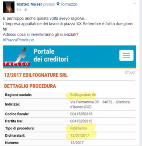 sua pagina Facebook, a mettere al corrente la comunità tolmezzina della dichiarazione di fallimento della ditta appaltatrice dei lavori di riqualificazione di piazza XX Settembre a Tolmezzo, la Edilfognature Srl di Gradisca d’Isonzo (Go), dichiarazione pubblicata sul portale dei fallimenti del Tribunale di Gorizia, in data 13 luglio 2017.