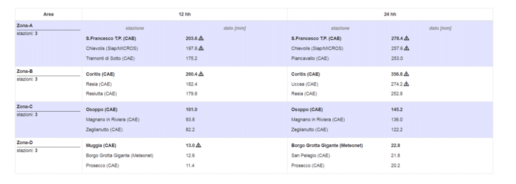 In tabella le precipitazioni delle ultime 12 e 24 ore: