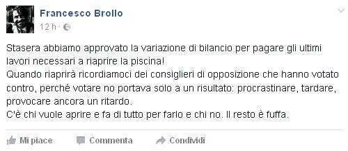 Al termine della seduta il sindaco Francesco Brollo sul suo Profilo Facebook ha scritto: “Stasera abbiamo approvato la variazione di bilancio per pagare gli ultimi lavori necessari a riaprire la piscina! Quando riaprirà ricordiamoci dei consiglieri di opposizione che hanno votato contro, perché votare no portava solo a un risultato: procrastinare, tardare, provocare ancora un ritardo. C’è chi vuole aprire e fa di tutto per farlo e chi no. Il resto è fuffa”.