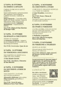 Il tragitto è diviso in sette tappe, una per chiesa a partire da Dierico di Paularo con arrivo a Rivalpo di Arta Terme (sabato 18 ottobre) e attraversa luoghi prevalentemente a mezza e bassa quota, per lunghi tratti nel silenzio, su antichi tracciati spesso ormai in disuso, toccando borghi spopolati, santuari alpini, cascate, pievi solitarie, luoghi artistici, siti archeologici.