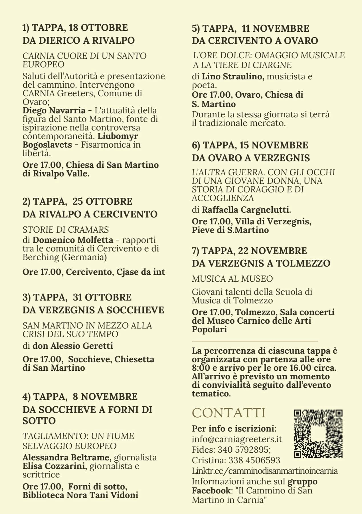 Partendo da quest’idea del Santo in cammino alla ricerca dell’essere umano, considerando tutte le numerose chiese, cappelle, edicole a lui dedicate in ogni dove e dunque anche in Carnia, è nata l’idea di poter compiere un viaggio ideale toccando a tappe tutti gli edifici sacri che portano il suo nome, denominato il “Cammino di San Martino in Carnia”.