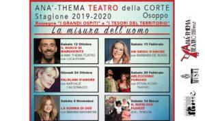 Ricca anche la stagione dei “Tesori del territorio”, il cartellone nel cartellone che Anà-Thema vuole dedicare, sempre a Osoppo, ai protagonisti di queste terre e alla marilenghe e che, stagione dopo stagione, riscuote sempre più apprezzamento e interesse da parte di un pubblico variegato. Si parte il 14 marzo con “Il miedi par fuarce” proposto dalla compagnia “El Tendon”, per proseguire il 28 marzo con “Angela” e la compagnia “Drin e Delaide”. I “Sot la nape” proporranno invece, il 18 aprile, “News in the gnot”, mentre il 2 maggio “La Pipinate” presenterà “Non sta viarzi chel armar”. Chiude il cartellone dei “Tesori del territorio”, il 16 maggio, lo spettacolo “Provaci ancora Todero” della compagnia “Arc di San Marc”.