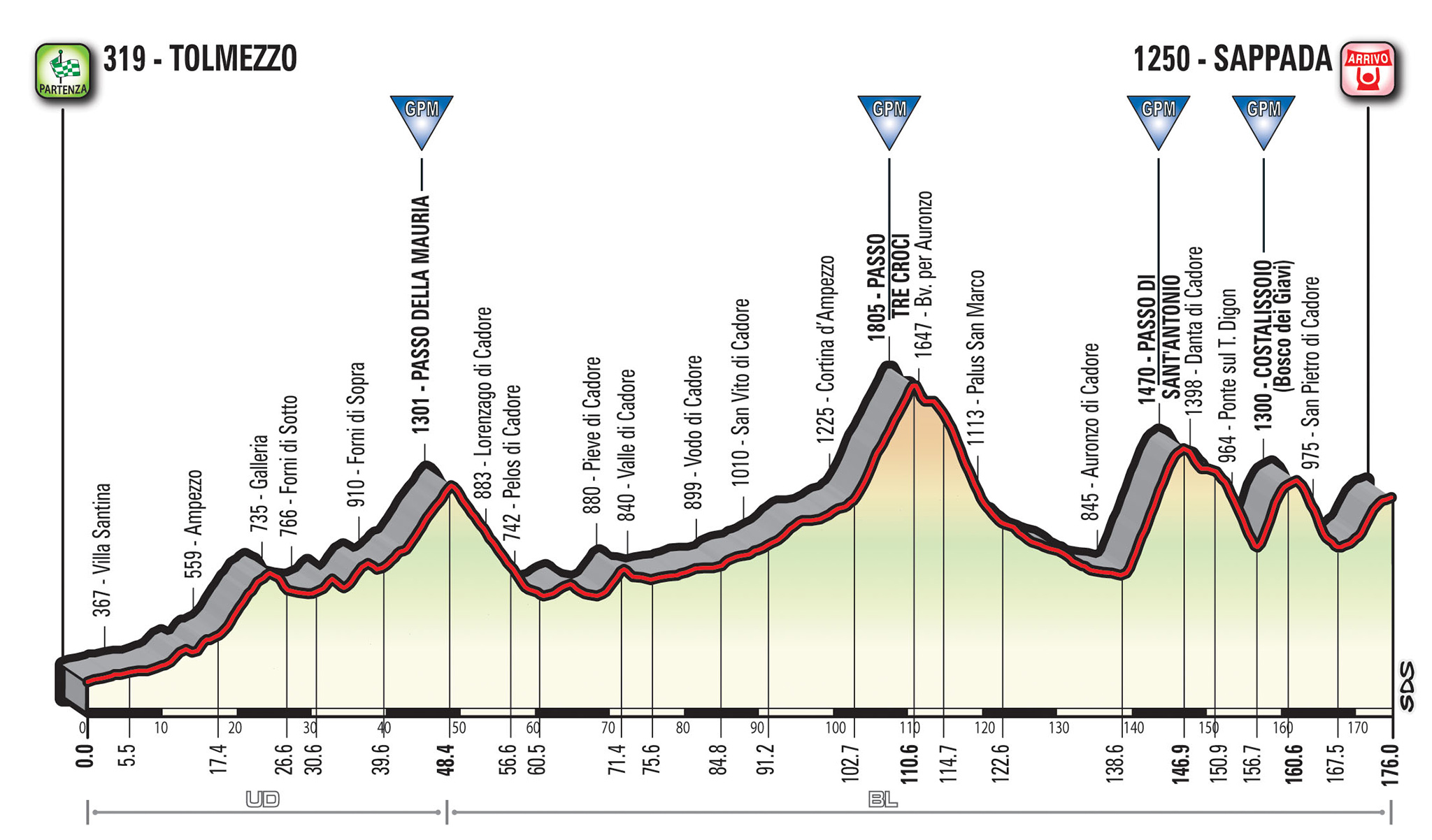 Il giorno successivo, domenica 20 maggio, è prevista la tappa numero 15 con partenza da Tolmezzo e arrivo a Sappada, ai piedi delle sorgenti del Piave, della lunghezza complessiva di 180 chilometri. I corridori attraverseranno questa volta la valle del Tagliamento, con passaggio a Villa Santina, Ampezzo, Forni di Sotto, Forni di Sopra, il Passo della Mauria e poi la valle del Boite verso Cortina. Quindi saranno affrontate in serie due salite impegnative, il Passo Tre Croci e, dopo il rapido passaggio ad Auronzo, il San Antonio, 9 km di ascesa, 600 metri di dislivello e almeno tre tratti impegnativi con pendenze superiori all’11%.