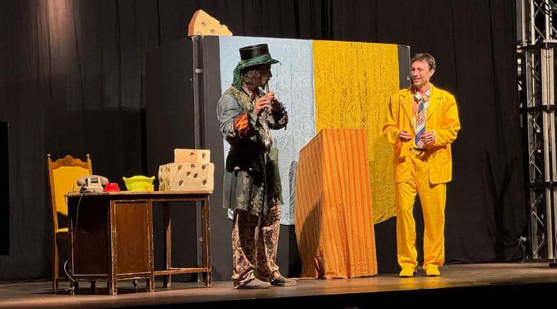 Nel paese di Emmental tutti sono felici e l’attività principale è la fabbricazione di formaggio per il Signor Caciotta, ricco faccendiere senza scrupoli. Ma un giorno appare un astuto topo di città e le trappole non servono a nulla. Si viene a sapere di un pifferaio capace di liberare qualsiasi paese dai topi, ma il servizio costa caro e il proprietario della fabbrica è talmente avaro che si propone come sindaco per caricare la prestazione del pifferaio sui conti pubblici. Con il coinvolgimento del pubblico come cittadini votanti, si innesca la campagna elettorale per un finale affatto scontato e tutto da vedere.