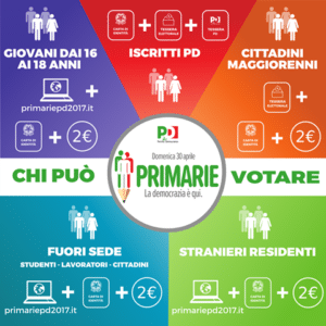 Per votare bisogna recarsi ai seggi il giorno del voto muniti di documento di identità e certificato elettorale. Sarà necessario dichiararsi elettori del Partito democratico e versare 2 euro come contributo spese per l’organizzazione delle primarie. Esistono però alcune categorie di votanti per i quali è obbligatoria la preregistrazione online: gli elettori fuori sede, i ragazzi tra i 16 e i 18 anni, i cittadini Ue residenti in Italia e quelli stranieri in possesso del permesso di soggiorno. Per queste tre categorie la preregistrazione online è indispensabile per poter votare nei seggi il 30 aprile: la si deve fare sul sito www.primariepd2017.it entro le ore 12 di giovedì 27 aprile, presentandosi poi al seggio con la ricevuta della preregistrazione online.