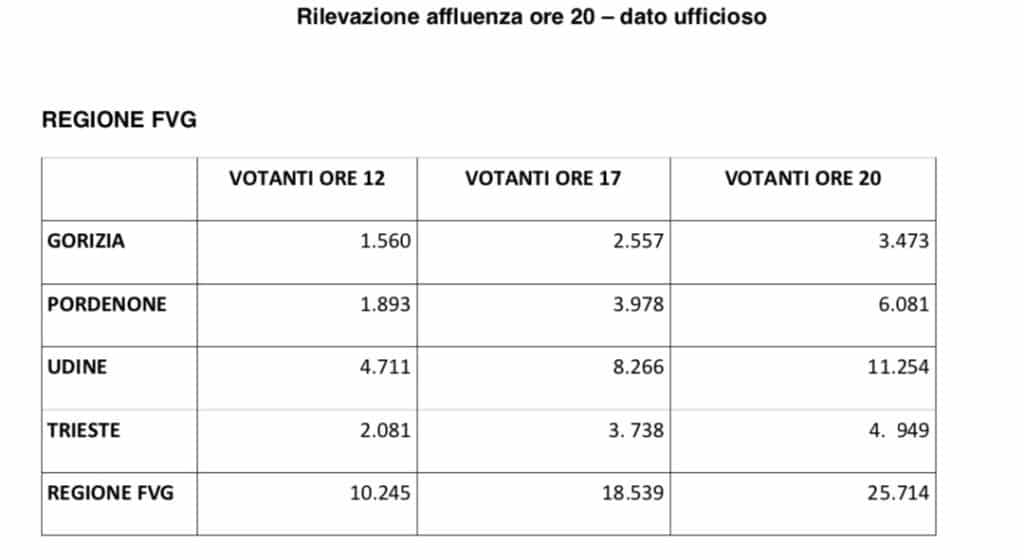 In tutta la regione hanno votato 25.536 persone. Il dato definitivo è stato registrato alle ore 20, a chiusura seggi. Nel corso della giornata erano state effettuate altre due rilevazioni: alle 12 (10.245 votanti) e alle 17 (18.539). Le operazioni di voto si sono svolte regolarmente nell’arco dell’intera giornata.