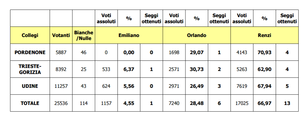 In Fvg vince Matteo Renzi con il 66,97% dei voti, mentre Orlando raccoglie il 28,48% delle preferenze ed Emiliano il 4,55%. L’ex segretario prevale in tutte e quattro le province.