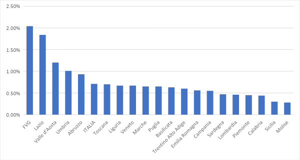 Il FVG è la regione italiana con la più alta propensione a fare rete (rapporto tra il numero delle imprese in rete e il totale delle imprese attive), con un tasso del 2,04%. Seguono Lazio (1,84%) e Valle d’Aosta (1,20%). La media nazionale si attesta solo allo 0,71%.