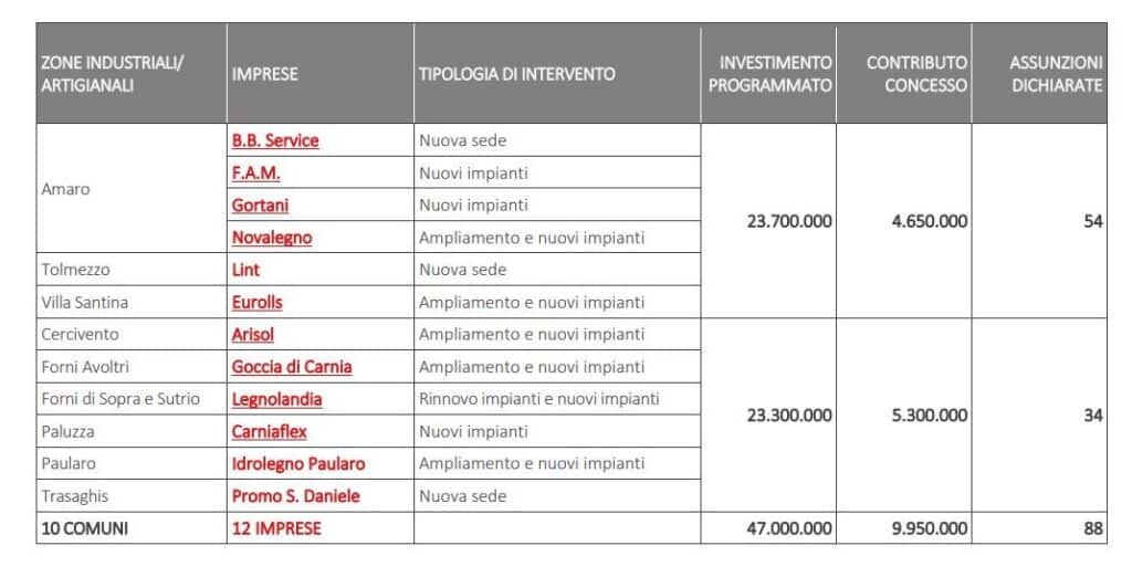 Sono 12 le aziende che risultano beneficiarie, a fronte dei rispettivi programmi di investimento, insediate nei comuni di Amaro (4 aziende), Tolmezzo e Villa Santina (nella foto), ma anche di Cercivento, Sutrio, Forni Avoltri, Forni di Sopra, Paluzza, Paularo e Trasaghis, per un investimento complessivo di € 47.000.000 e un incentivo regionale già concesso o in fase di assegnazione per quasi 10.000.000 di euro.