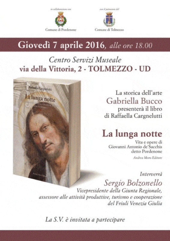 Giovedì 7 aprile alle ore 18.00 nel Centro Servizi Museale di Tolmezzo, la storica dell’arte Gabriella Bucco presenterà “La lunga notte. Vita e opere di Giovanni Antonio de’ Sacchis detto Pordenone“, scritto da Raffaella Cargnelutti (Andrea Moro Editore, 2015).