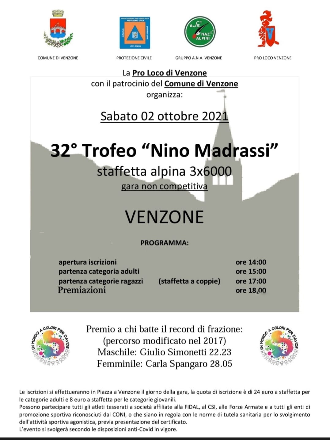 Apertura iscrizioni alle 14 in piazza a Venzone, partenza gara adulti alle 15, mentre la staffetta a coppie per i ragazzi inizierà alle 17. La giornata si chiuderà alle 18 con le premiazioni.