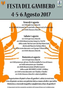 Da venerdì 4 a domenica 6 agosto il programma prevede musica (le Pink Armada nella prima serata, Il Musichiere nella seconda, Claudio e Claudia domenica), dimostrazioni di Kung Fu e Tai Chi ma anche di ballo country, oltre ovviamente alla degustazione di piatti a base di gamberi.