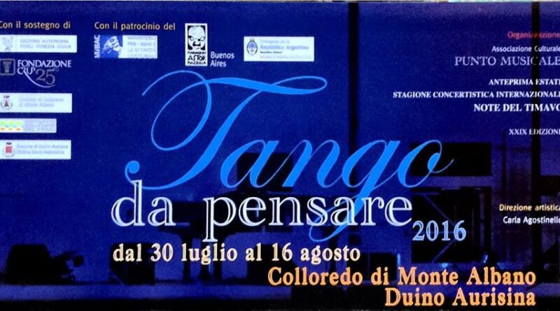 Presenti quindi tutte e due le sedi “storiche”, a continuazione di un sodalizio con il Comune di Duino Aurisina dove l’Associazione è presente da oltre ventinove anni con corsi di musica e la consolidata Stagione Concertistica Internazionale autunnale Note del Timavo, presso il Tempio di S. Giovanni in Tuba, ed il Comune di Colloredo di Monte Albano, presso il Castello di Colloredo,dove gli appuntamenti estivi ed autunnali si susseguono da oramai tredici edizioni. Il tutto è a cura dell’Associazione Culturale Punto Musicale per la direzione artistica di Carla Agostinello, con il contributo della Regione Friuli Venezia Giulia, del comune di Duino Aurisina, del Comune di Colloredo di Monte Albano, della comunità Collinare del Friuli, della Fondazione Crup alla quale va un particolare ringraziamento, e Digas; la manifestazione si avvale poi dell’Alto Patrocinio del Ministero per i beni e le attività culturali,dell’Embajada del la República Argentina in Italia e della Fundacion Astor Piazzolla di Buenos Aires .